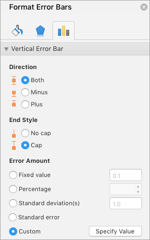 In the Format Error Bars pane, on the Error Bar Options tab, under Error Amount, click Custom, and then click Specify Value.