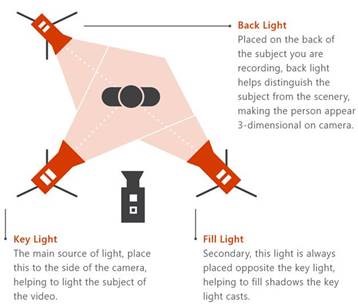 Use three lights to illuminate your subject—a key light, a fill light, and a back light to provide good depth.