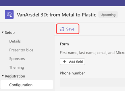 If you're creating the event, enter webinar details and select Save before continuing.