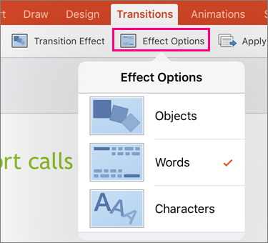 Next, select Effect Options to choose the kind of Morph transition you want to create. You can choose to optimize for Objects, Words, or Characters.