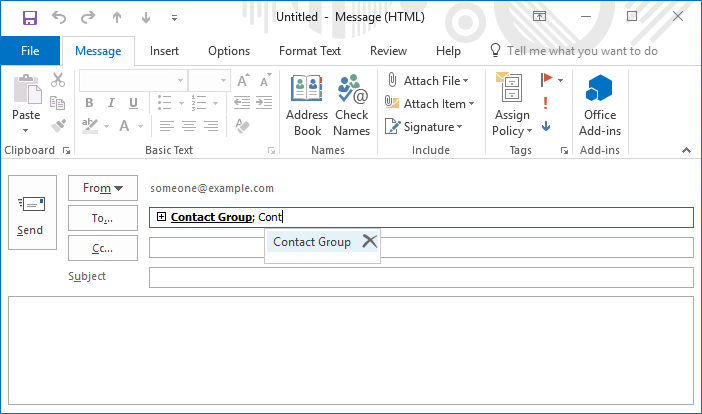 Type the name of the contact group and then press Alt+K or Ctrl+K to resolve it. In most cases, you can type a portion of the group name and then press Alt+K or Ctrl+K to resolve it.